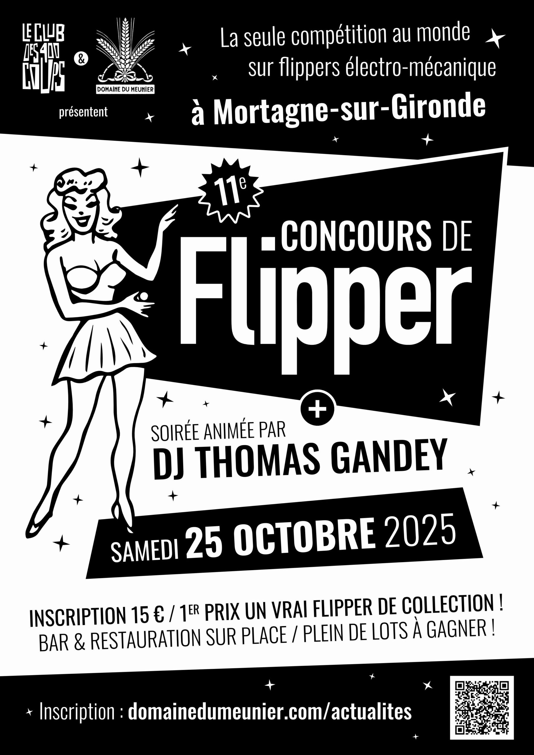 The Club des 400 Coups association is pleased to organize the 11th pinball competition followed by a dance party with DJ Thomas Gandey on October 25 at the Salle Parias Frères/Le Hangar du Port in Mortagne-sur-Gironde.